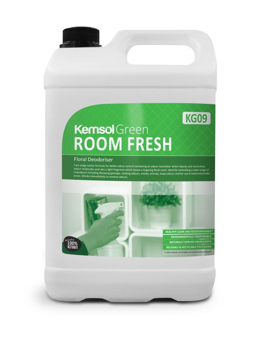 ROOM FRESH has a two-stage action to odour control. It has an odour neutraliser which attacks odour molecules and neutralises them and also contains a light fragrance which leaves a lingering floral scent. It is ideal for controlling a wide range of malodours including decaying garbage, cooking odours, smoke, animal odours, body odours and for use in bathroom/toilet areas.