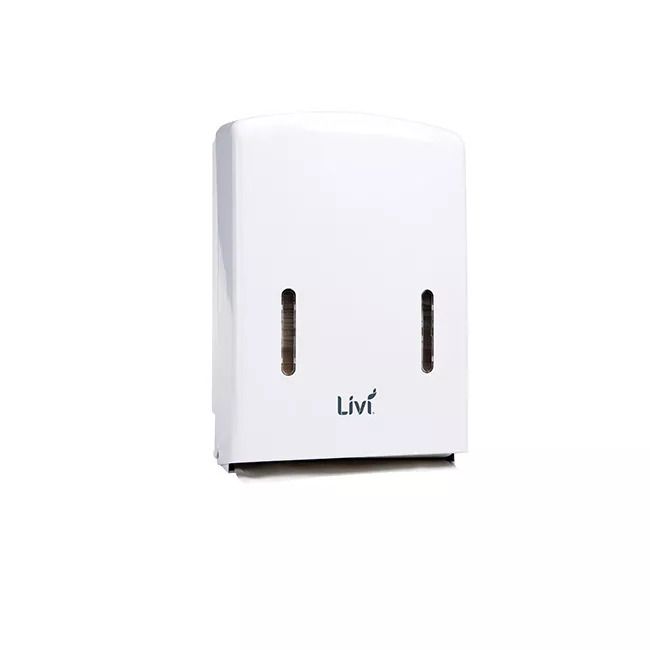 The Livi Slimfold Towel Tall Dispenser measures 280mm W x 110mm D x 400mm H.