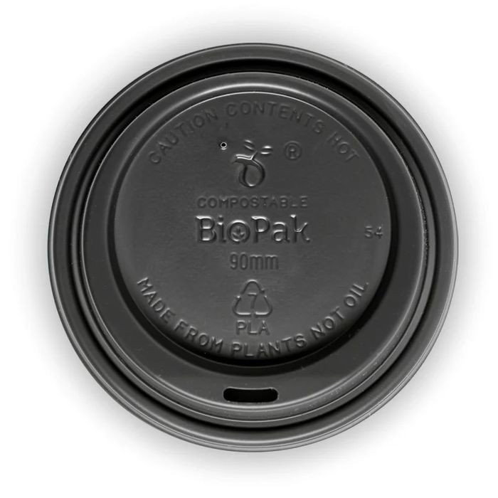 Biopak 90mm Large Black PLA BioCup Lid 8,12,16,20 oz Cups 50 units per slve