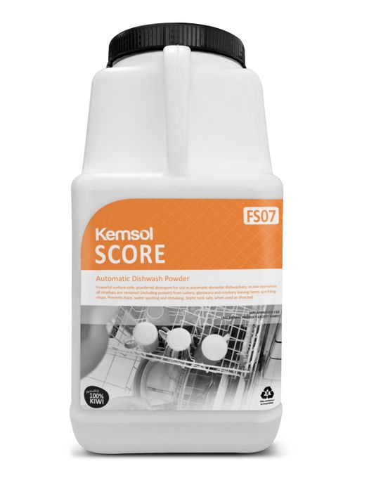 SCORE is a powerful surface and user safe powdered detergent for use in dishwashers. In one operation it removes all residues (including protein) from cutlery, glassware and crockery leaving them sparkling clean. It prevents haze, water spotting and streaking. DO NOT USE ON ALUMINIUM OR SILVER SURFACES, ITEMS OR UTENSILS.